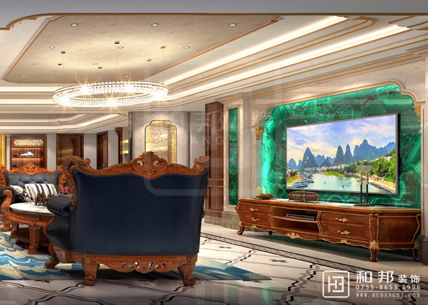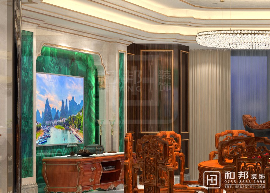 本案從孔雀綠玉石背景墻上彰顯出特意的設(shè)計質(zhì)感,也造就出深淺對比,層次有序的精致風(fēng)華。